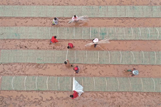 3月22日,在眉山市东坡区太和镇永丰村,农民在田里开展水稻育秧作业(无人机照片)。春耕时节,各地农民抢抓农时,积极开展早稻育秧工作,为丰产丰收打好基础。
