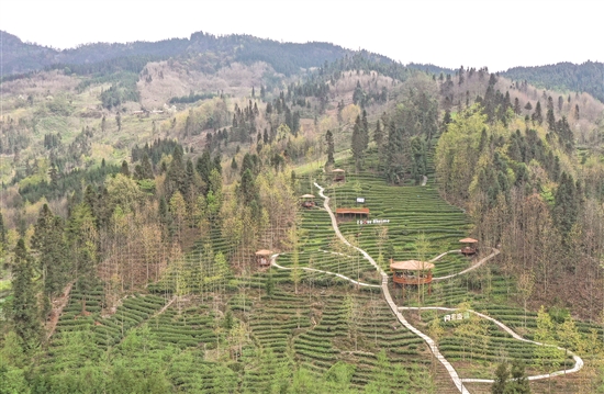 这是4月4日在四川省汶川县水磨镇牛塘沟村拍摄的茶园(无人机照片)。