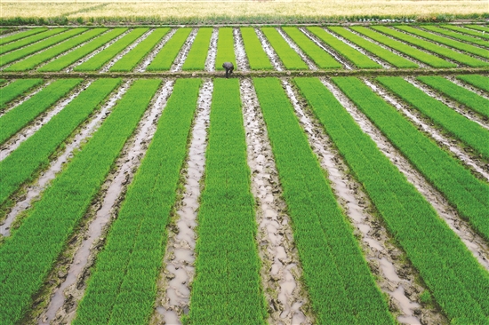 4月20日,在四川省眉山市东坡区太和镇永丰村,村民在育秧基地里检查水稻秧苗。
