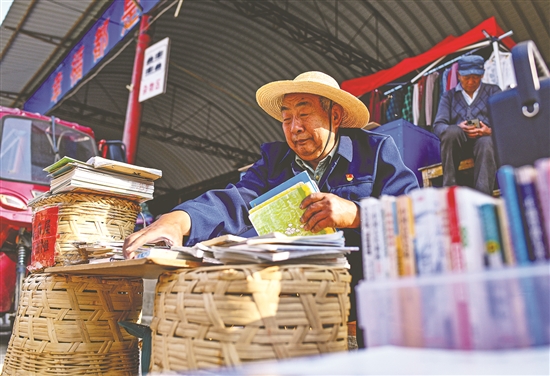 4月19日,李存德在红星村的爱心流动书摊整理书籍。 早晨7点半,71岁的李存德拉起他改造的小车,戴上草帽,拄着拐杖,迎着晨光,来到村里集市的一角,将书报杂志摆放整齐,便开始出摊了。他的爱心流动书摊刚刚支起,便有村民围上来翻看书报。 李存德是云南省弥渡县弥城镇红星村人,是该村农家书屋的管理员。为了更加方便当地群众阅读书报,自2019年起,他用自己改造的小车,将农家书屋里的书报杂志,连同各方捐赠的图书,拉到热闹的集市上,供村民免费借阅。 记者问起哪类书籍更受欢迎,李存德说:“贴近老百姓生活的书,养羊养牛的,种庄稼的,小孩子们爱看绘本。” “一开始就摆一条板凳,现在四条板凳还不一定够坐。”李存德说,4年多来,在各方关心支持下,书摊上的书籍越来越丰富,前来阅读的人也越来越多。 如今,小小的爱心流动书摊,成为村民赶集之余阅读和交流的好去处,给热闹的集市增添了别具一格的书香气。新华社记者 江文耀 摄 |