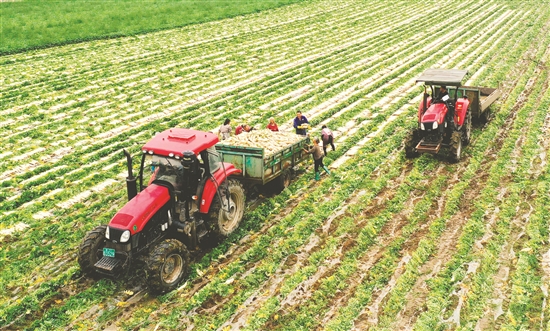 5月6日,村民在四川省眉山市青神县青竹街道季时坝村一家庭农场将采收的白萝卜装车(无人机照片)。