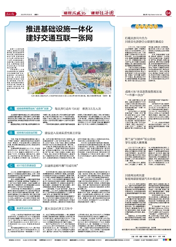 实现省第十二次党代会报告提出的“建强现代化成都都市圈”目标,基础设施一体化建设是重中之重。近年来,成都都市圈加快推进干线铁路、城际铁路、市域(郊)铁路、城市轨道四网融合和高速公路、快速路、城市轴线一体化布局,协同建设区域交通互联一张网。