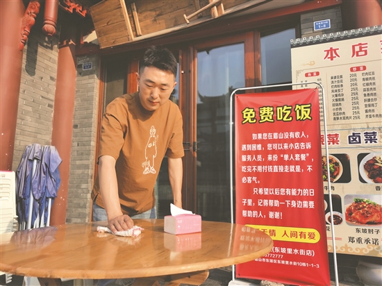 “我们店开了两年多,这个牌子就一直放在这里。真正来免费吃饭的人不多,大概有十二三次。看得出来,他们的确是遇到了困难。”肖平说,走进店里的人只要对服务员说一句“来份‘单人套餐’”,服务员就知道了。