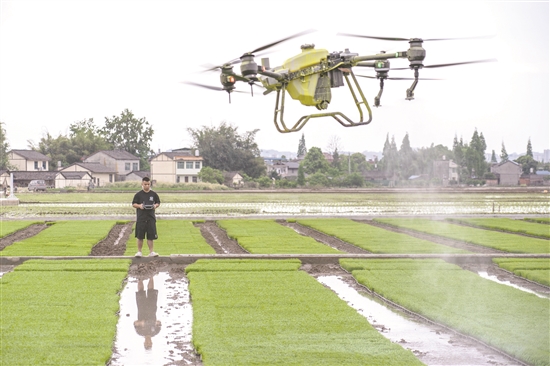 “采用无人植保机进行田间管理很方便。无人植保机喷施农药的效率是人工的100倍以上,施化肥的效率是人工的200倍以上,今年我们会大力推广这种方式来进行田间管理。”彭山区农业农村局农技人员说。