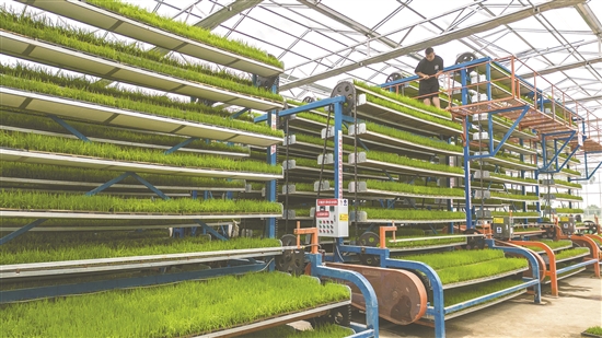 流水线作业、机器手上岗、自动摆盘……一座钢化玻璃结构的育秧工厂尽显“科技范”。4台巨大的循环运动式育秧苗床缓缓将秧盘从“地上”送往“空中”,喷淋设备不时喷出水雾,滋润着一盘盘即将移栽大田的壮硕秧苗。