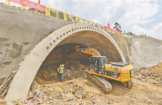 6月6日,成渝中线高铁缙云山隧道施工现场,施工人员正在加紧作业。