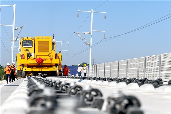 9月6日,在四川省泸州市冯湾特大桥施工现场,智能铺轨机在进行铺轨施工。