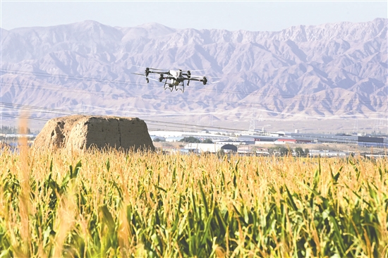这是9月5日在山丹县位奇镇十里堡村拍摄的“一喷多促”作业现场。