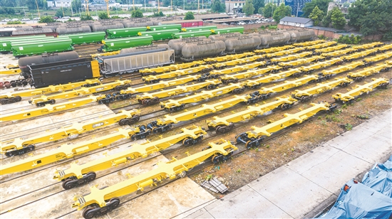连日来,中车眉山车辆有限公司出口澳大利亚的三关节平车、粮食漏斗车,以及几内亚的供风平车、矿石漏斗车等产品密集发送。图为三关节平车发送现场。