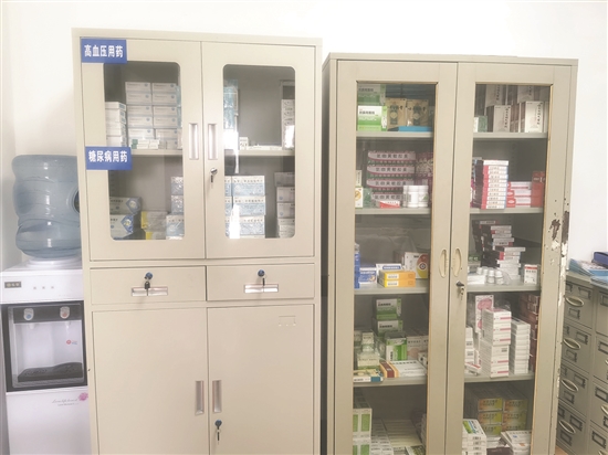 现场可以看到,诊断室、治疗室、公共卫生室、药房宽敞明亮,血压计、血糖仪、指夹式血氧仪、医用牵引椅、脉冲针灸治疗仪等基础医疗设施设备配备到位,消炎、止咳、化痰、退烧、消化系统、高血压、糖尿病等基本药物应有尽有……