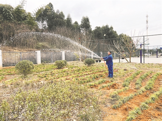 3月12日是我国第46个植树节。当天,眉山方大炭素公司各部门在物业科专业人员的指导下分工合作,进行挖坑培土、搬苗铺种、牵管浇水等绿化活动。爱绿、植绿、护绿已成为全体员工的共识,该公司各部门纷纷利用工作间隙进行绿植补种和绿化养护工作。图为眉山方大炭素公司设备部员工正在为新种的绿植浇水。