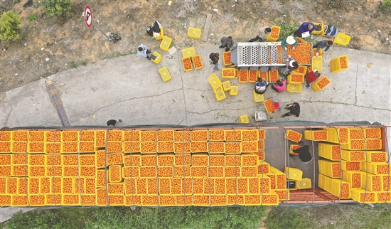 近日,四川省眉山市东坡区晚熟柑桔产业园引进种植的上万亩无核沃柑喜获丰收进入采摘期,当地抓紧组织采摘以满足省内外市场需求。 中新社发 姚永亮 摄