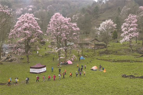 4月14日,在江油市永胜镇藏王寨村,一队户外爱好者背着行李穿行在辛夷花树下。