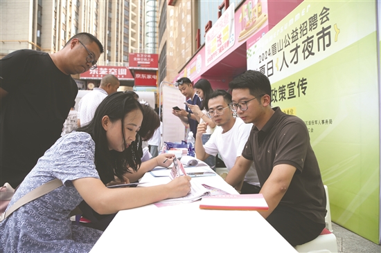 7月6日,东坡区春熙广场,求职者在首场夏日人才夜市上与用人单位工作人员交流应聘相关岗位。