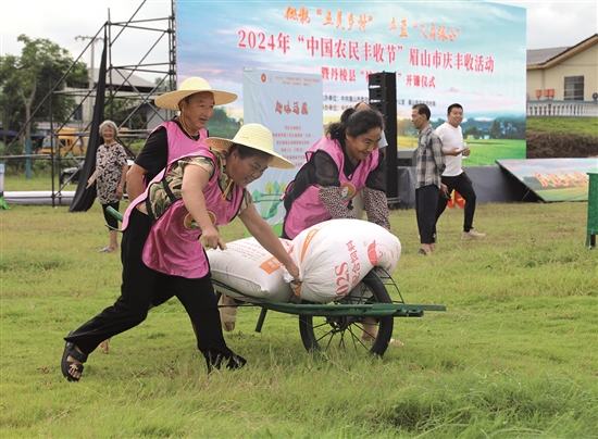 运粮、割谷打谷、稻田捉鱼俗称“农人三项”,是丰收节庆祝活动中的一大亮点,也是群众参与度最高的环节。丹棱县5个乡镇分别派出代表队参赛,按照三项比赛的总分高低进行排名。