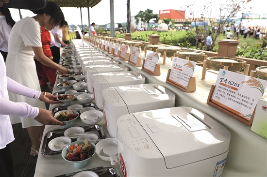 “这里有19锅香喷喷的大米饭,都是刚从田里收来的稻米制作而成,欢迎大家品尝!”在当天的庆祝仪式上,阵阵饭香弥漫在会场上空。在工作人员的介绍下,“野香优莉丝”“金峡金·黄金稻”“低碳控糖大米”“品香优12”等19种大米的特性、口感让品尝者有了目标。
