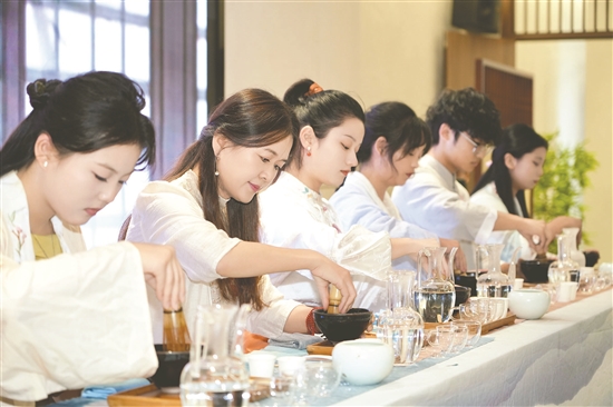 本报讯(眉山日报全媒体记者 古良驹 文/图)10月13日,眉山市公共实训基地李倩大师工作室热闹非凡,一场精彩绝伦的非遗东坡传统点茶技艺传承与创新比赛在此举行。 宋代点茶作为中国传统茶文化的重要组成部分,以其独特技艺和深厚文化底蕴深受人们喜爱和推崇。 比赛分为两个环节。第一个环节以冲点一碗色、香、味、沫俱佳的点茶茶汤为目标,考量选手的汤沫调控能力和茶汤与茶沫均匀分杯能力。选手们从提供的茶具中选择相匹配的茶具,以五人为一小组进行比赛。每位选手各点一盏茶,先由裁判评判茶汤茶沫质量,再分成三小杯,从分杯质量、汤温、汤量和茶汤浓度等多个方面进行综合评分。比赛现场,选手们全神贯注,用精湛的技艺展示着对传统点茶技艺的深刻理解和独特创意。随着一组组选手的精彩展示,现场气氛紧张而热烈。 紧接着,进入决赛的前八名选手进行茶百戏与茶膏画创新设计,并讲解宋代点茶技艺。 此次比赛不仅展示了选手们的高超技艺和创新能力,也为非遗东坡传统点茶技艺的传承与发展注入了新的活力。 |