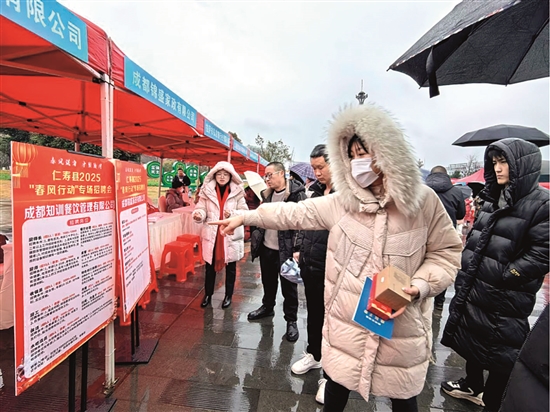 2月7日上午9时,天空下着蒙蒙细雨,东坡区东坡湖广场人头攒动、热闹非凡,以“才聚新春 就业眉好”为主题的眉山市2025年新春大型招聘会暨成德眉资同城化招聘会在这里举行。