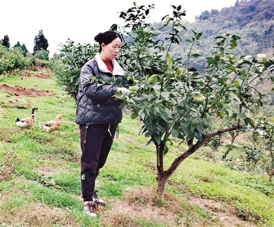 如今,兰敏的果园已成为当地远近闻名的生态果园,太阳能杀虫灯下,鸡鸭鹅成群,生草栽培,绿色防控,柑橘树枝繁叶茂。兰敏也成为五龙村妇联的妇女代表。