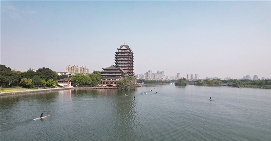 近年来,眉山充分挖掘体育消费潜力,将“体育+”和“+体育”积极融入全市现代产业体系中,有力促进文化、体育、旅游等产业在更大范围、更深程度融合发展,为眉山现代化建设加码赋能。图为皮划艇运动健儿在位于东坡湖的市水上运动中心,进行技术、耐力等方面的训练。