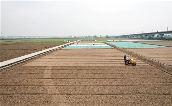 近日,在东坡区太和镇永丰村,村民们抢抓农时,有序进行智能水稻育秧工作。图为村民正在机械化配置秧床。