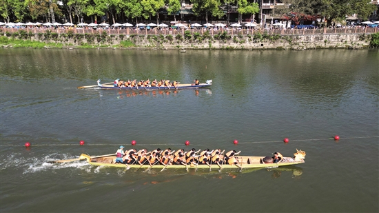 “加油!加油……”4月17日,“同舟共济护锦江 携手共建两地情”成眉城际龙舟友谊对抗赛在锦江中热闹开展。成都市双流区黄龙溪镇与眉山天府新区锦江镇各派出8支龙舟队,齐聚赛场,展开激烈角逐。