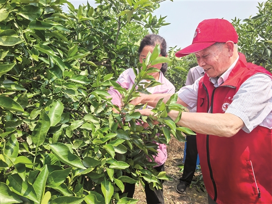 本报讯(眉山融媒首席记者 李幸 实习生 吴佳欣 文/图)“雷老师,请帮忙看看,为什么爱媛果树叶子有斑点油汗?”6月4日,东坡区富牛镇松林社区,果农任兴全带着农技志愿者、高级农艺师雷农田走进自家果林,急切地提出了问题。当天,来自眉山市老年科技工作者协会的14名“眉州银龄·农技志愿服务队”成员,在这里开展了“银龄助力产业发展”活动。 今年4月,市老龄办印发方案,决定今年在全市有序启动“眉州银龄”老年志愿服务行动,即“眉州银龄行动”,引导老年人当好“指导员”“顾问员”“宣传员”“智囊员”“监督员”,为产业发展、文化传承、基层卫生健康、养老服务、青少年成长等贡献“银龄力量”。 “乡村振兴”是“眉州银龄行动”的重要主题之一,聚焦乡村产业振兴,市老科协组织老年科技工作者组成“眉州银龄·农技志愿服务队”,来到田间地头,为果农、粮农送上“良方”。当天,农技志愿者分成小队,走进果园,实地查看柑橘树生长情况,手把手指导果农观察果树长势、补剪枝条、浇水施肥。在集体果园里,4名农技志愿者为果农们讲解了病虫害防治、肥水管理、控制夏梢等具体知识,并针对果农的问题进行了答疑解惑…… “老年科技工作者作为老年人才队伍中高知识、高技能、高素质的群体,应该持续发挥所长,为乡村振兴、产业发展贡献力量。”市老科协会长杨大兴说。他表示,接下来,市老科协还将组织老年科技工作者围绕粮食、柑橘、泡菜、茶叶等重点、特色农业产业,开展技术指导、技术培训及项目支持等服务,助力全市产业发展,为眉山乡村振兴和建设现代化都市圈高质量发展新兴城市贡献“银发力量”。 记者从市老龄办了解到,“眉州银龄行动”开展以来,全市已有800余名老年人注册成为银龄志愿者,组建老年志愿服务队70余支,开展活动70余场(次),服务覆盖人数近万人次。 |