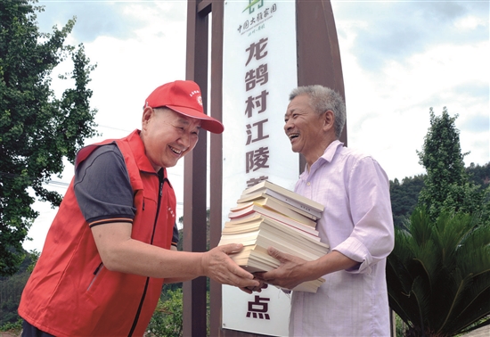 6月19日,在丹棱县齐乐镇龙鹄村江陵养老服务点,该服务点负责人倪瑞华接过丹棱县老协代表万玉忠赠送的书籍。