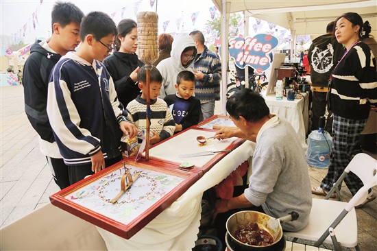 与紧张的赛场氛围不同,位于市民文化中心的“骑享彭山”非遗市集则是一片悠闲惬意的景象。这里汇聚了二十余个非遗展示、美食、文创等摊位,现场人头攒动、热闹非凡。“为提升市民、游客的参与度和体验感,非遗市集的布局注重动与静、现代与传统、体验与欣赏有机结合,让人看得见、摸得着、尝得到、带得走。”彭山区文广旅局相关负责人说。