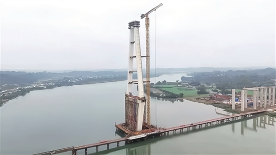 近日,记者航拍正在建设中的青神汉阳岷江特大桥。大桥正在加紧施工,预计2026年1月大桥主塔封顶。