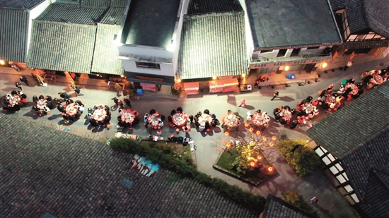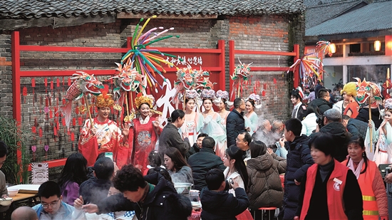 本报讯(眉山融媒记者 雷同 文/图)12月20日晚,太和老镇历史文化街区举行长街宴系列活动,吸引近千名游客参加。席间还有各类文化巡游活动,为游客们带来非同寻常的用餐体验。 现场百余张大圆桌在太和老街正街和香樟街“一字长龙”排开,吸引近千位游客同席就餐。宴席上,汤锅蒸腾的热气与人群的欢笑交织。气氛热烈之际,街区悄然转换为舞台,“时光巡游”系列活动拉开帷幕:有流光溢彩的非遗鱼灯队、经典动漫人物小队和游客们热情互动;快闪舞蹈接力登场,展现青春活力;非遗变脸、吐火等传统技艺亦相继呈现,将现场氛围推向高潮。 活动以美食为媒,串联演出与互动,为近千名参与者营造出一个味觉、视觉、听觉交融的别样文化体验。 |